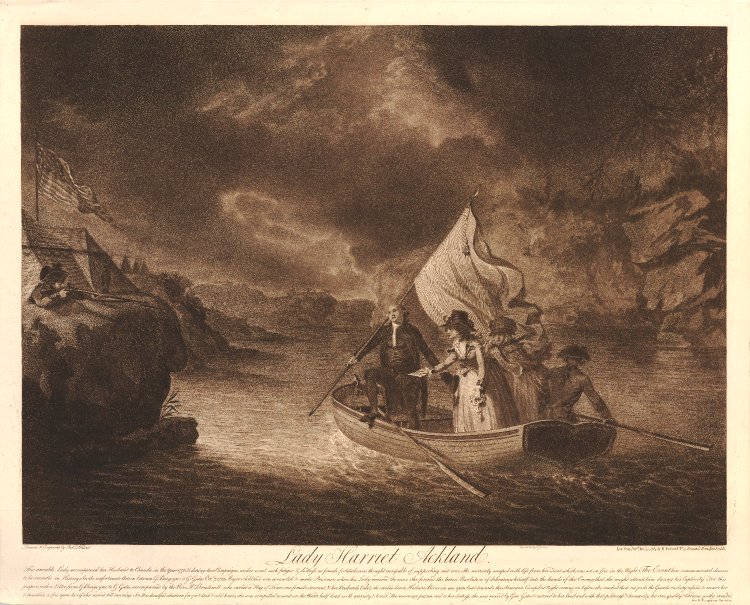 This 1784 painting by Robert Pollard depicts a scene from the American War of Independence, shortly after the Battles of Saratoga in 1777. The British forces had been defeated and one of their officers, Colonel John Dyke Acland, had been wounded and captured. In the painting, his wife Lady Harriet Acland, who had accompanied her husband to the Americas, holds out a piece of paper bearing a request from General Burgoyne (of the British forces) to General Gates (of the American forces) for Harriet’s safe passage to tend to her husband. To her left is Reverend Brudenell, a military chaplain, holding the white flag of truce. On the river bank an American guard holds them at gunpoint, suspicious of their intentions, threatening ‘to fire into the boat if they stirred before daylight’.[1] Eventually, General Gates allowed them through and reunited Harriet with her husband.