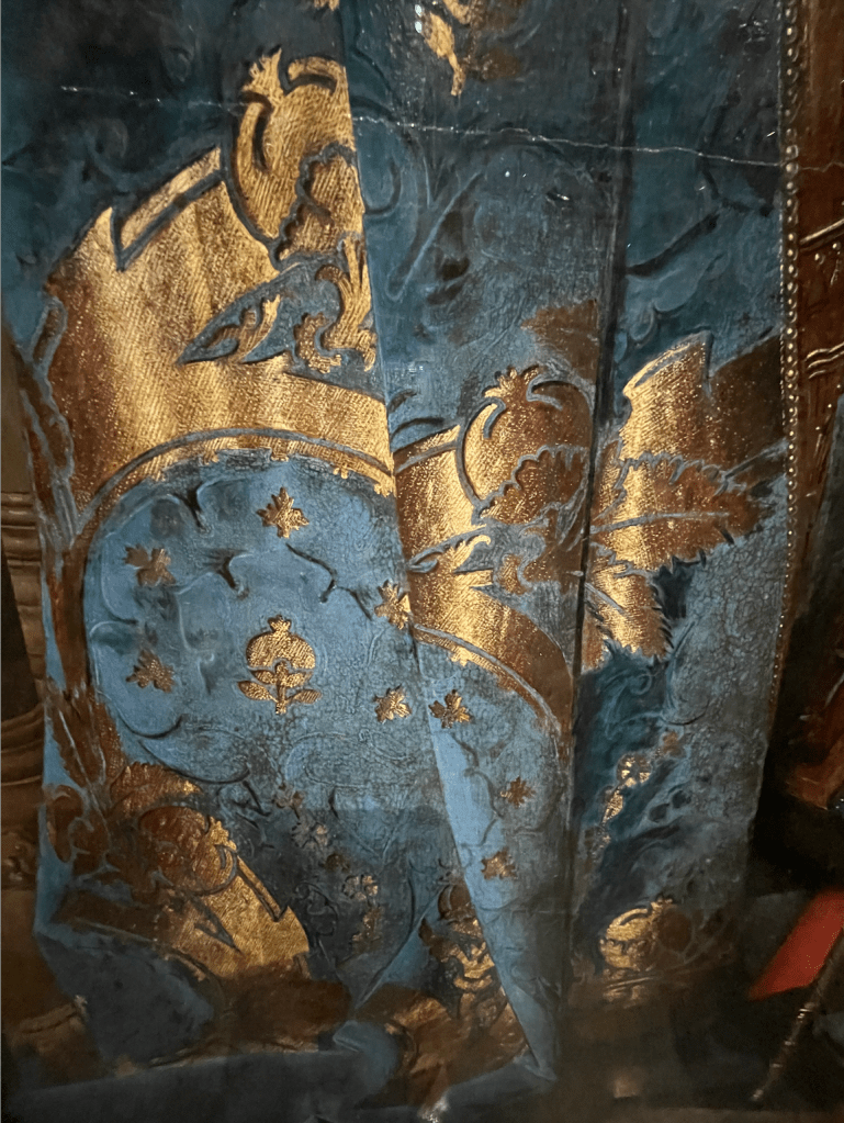 The expense and skill required to make velvet made it a status symbol, worn by kings and popes, and a valuable trophy of battle.[2] Battle is how a tabard of blue and gold velvet brocade wound up in the Altes Zeughaus, or old armory museum, in Solothurn, Switzerland. This blue and gold velvet brocade was captured from Burgundian troops by Swiss mercenaries.[3] It looks so much like the brocade in Jan van Eyck’s painting that I stopped in my tracks when I saw it. The textile was almost certainly made in Italy, but it was used in Burgundy, where Jan van Eyck painted.