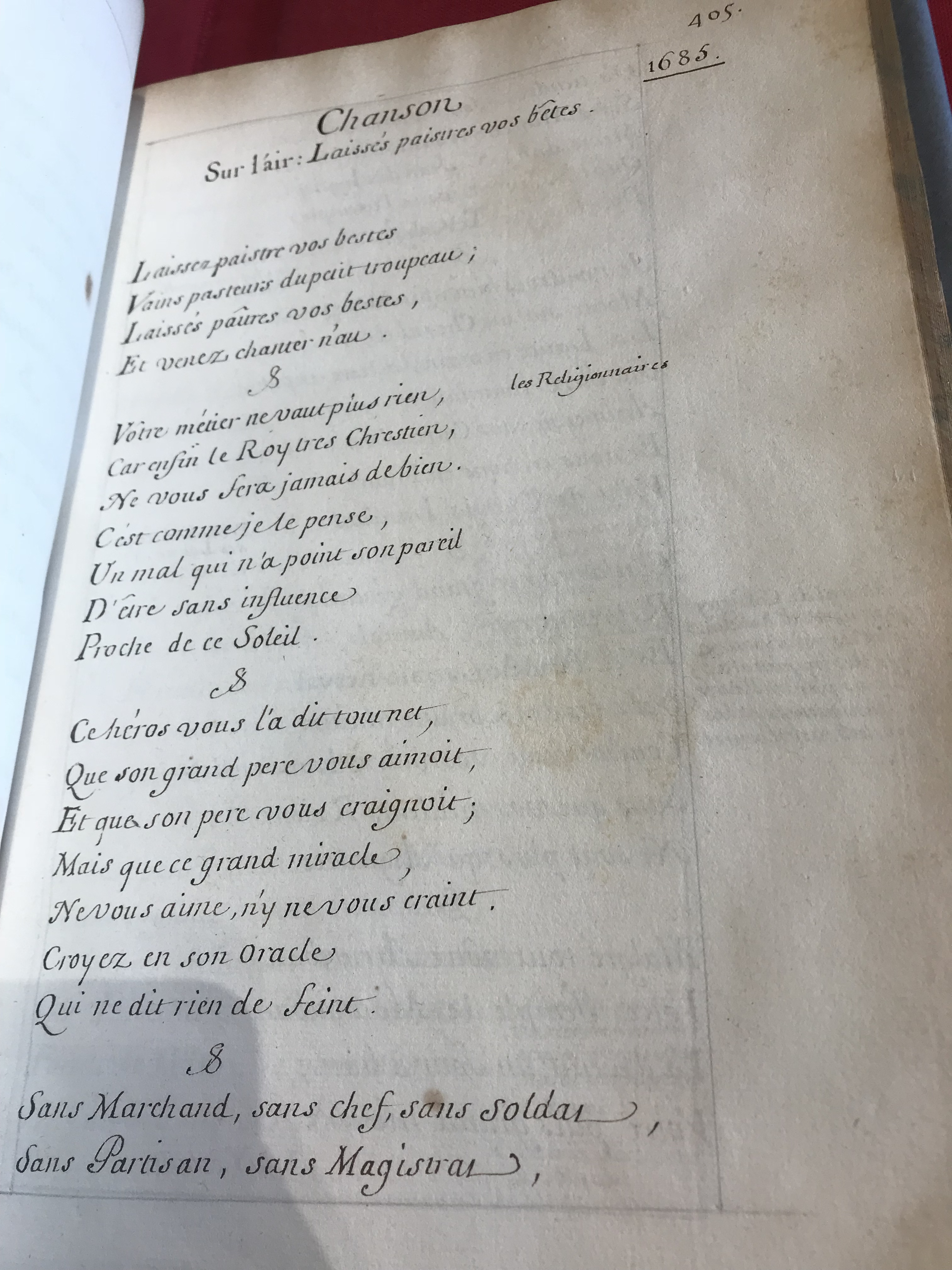 Fresh texts, set to old tunes, brought useful news of war and political change. They were also a perfect means for circulating gossip about the royal court. A favourite type of tune for gossip was the ‘Noël’ – the Christmas song.[2]A brief glance over the extant Noëls set to the sombre ‘Or nous dites Marie’ in the early 1700s tells us, for instance, that the Marquis de Gesvres was, unfortunately, ‘terrible in bed’, but a ‘rather good dinner companion’ and poor Mme de Nesle had foolishly slept with someone other than her ‘devoted’ M. d’Agenois.