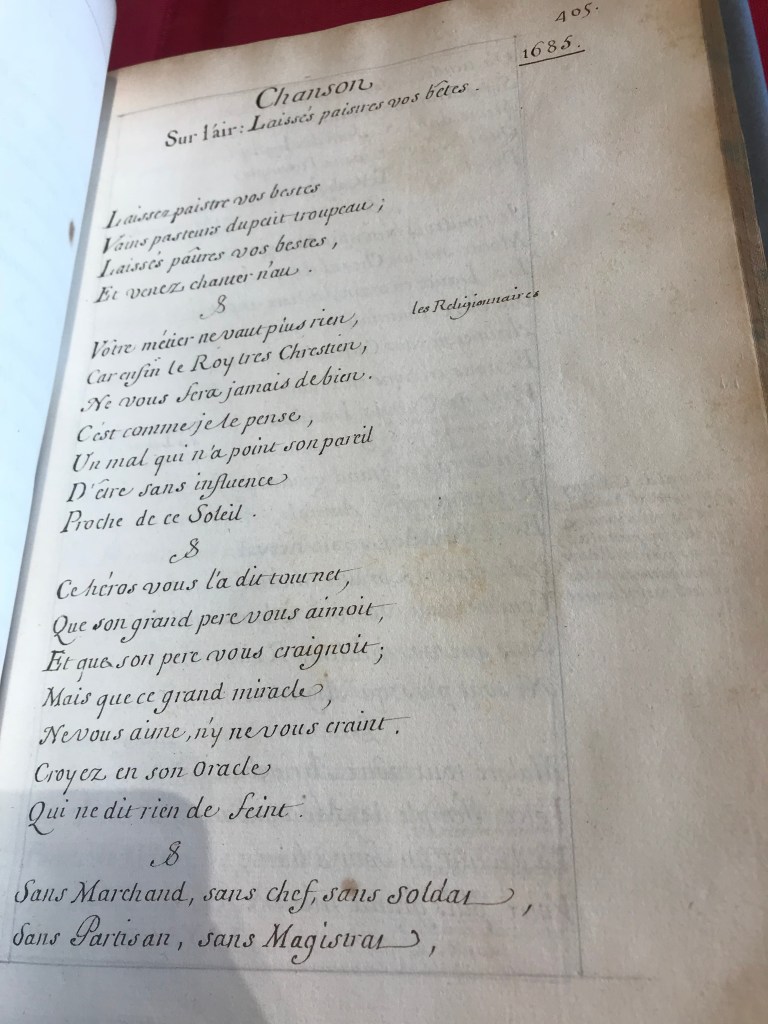 Strain your ears just a little to catch the words and you might be surprised. Urban song in early modern France consisted of ‘contrafacta.’[1] That is, new texts were usually set to a repertoire of pre-existing tunes, making these easier to memorise and accessible to the illiterate masses. Generations of listeners would associate political and social themes to the same tunes. If you had grown up in Paris, you would be able to tell from the very first notes of a song the singer’s political stance. These sources have reached us through various song collections, court records and texts hastily scribbled on scraps of paper.