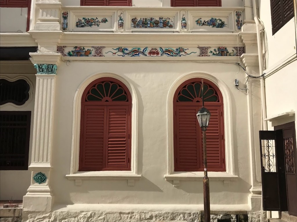 Upon entering, one is immediately greeted by the “Anglo-Chinese urban vernacular” facade of the building. Embracing the eclectic decorative styles that gained popularity in the late Victorian era, the structure embodies the Sino-colonial essence of 19th-century multifunctional shophouses. The building, painted in auspicious red according to Chinese cultural traditions, features European-influenced louvre windows adorned with Palladian-style fanlights and arched French windows. The exterior wall showcases European-style plaster bas relief stucco patterns, and the capitals of Corinthian-Doric columns are ‘sinocized’ in both motifs and color [See Figures 1 and 2 below].