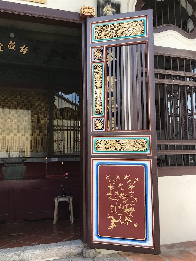 What intrigued me the most were the lattice door panels, with a translation of Mandarin phonetic borrowing into Malay fretwork. Upon close inspection, one can discern carvings depicting a vase (瓶, ping) of flowers positioned on a surface (案, an) at the center-left of the panel. The combined phonetic sound of these two characters yields the meaning of 平安 (Píng’ān), signifying ‘safety’ [See Figure 4].