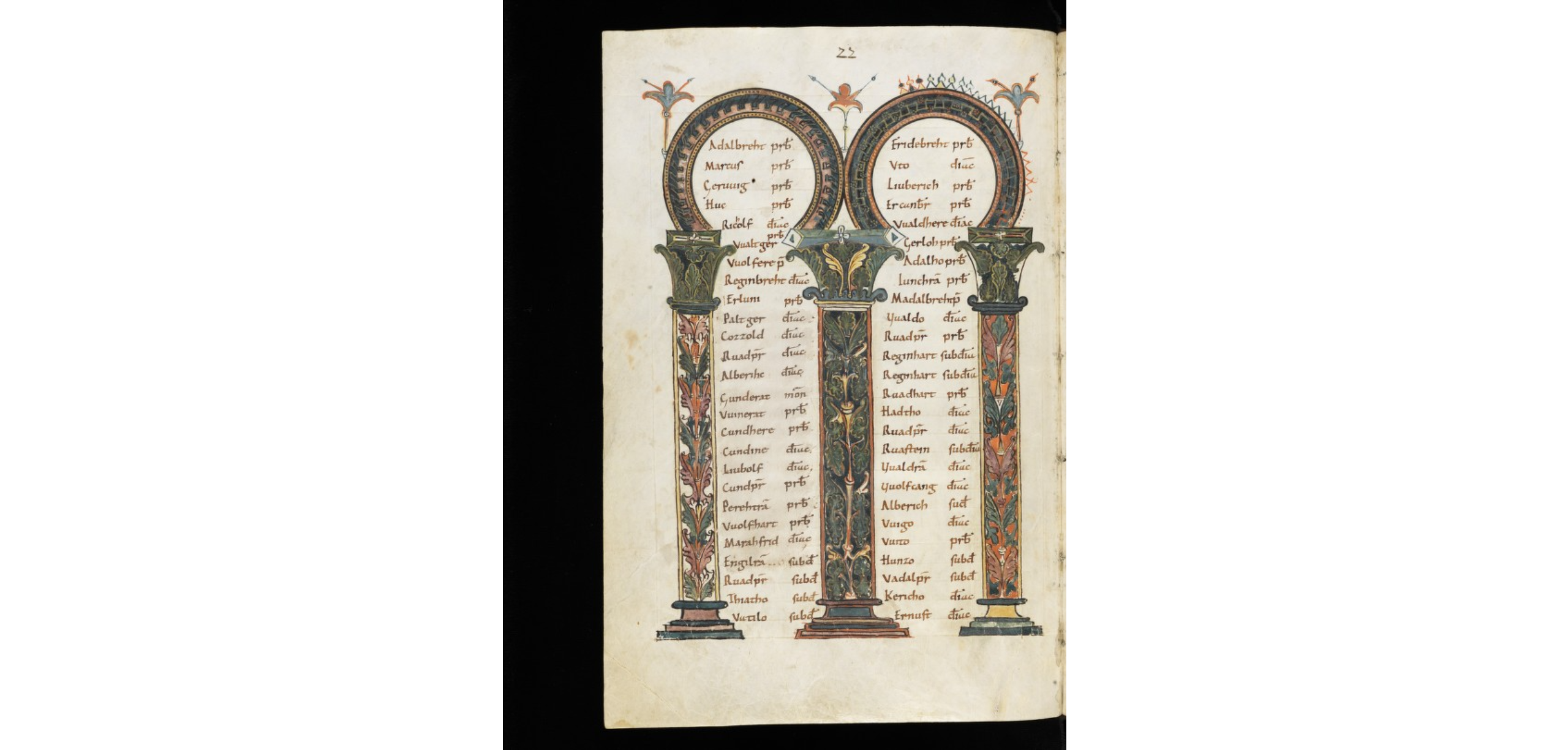 In recording the names of their own saints and community members within a similar frame, the original makers and later readers of the Guta-Sintram Codex defined the book as a sacred space. It is possible that the buildings at the top of the composition would have recalled the spaces in which community members lived and commemorated their dead. The martyrology-necrology of the Guta-Sintram Codex illustrates one way that memory and manuscript intertwined in medieval Europe.