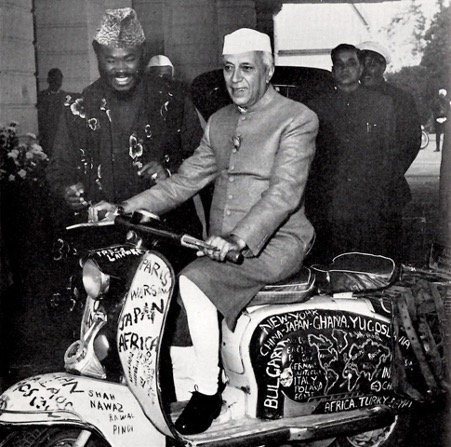 Figure 3 – Ọlábísí Àjàlá introduced Indian Prime Minister Jawaharlal Nehru to his globetrotting scooter. Source: Ọlábísí Àjàlá, An African Abroad, 1963.