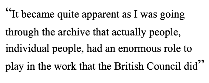 I did a Master’s, and my dissertation looked at the role that the British Council played in Britain’s own contribution to the cultural Cold War. But that was a very institutional focus I took, and it became quite apparent as I was going through the archive that actually people, individual people, had an enormous role to play in the work that the British Council did. It wasn’t all orchestrated from the top. It was very much, in a kind of imperial framing, what you’d called the ‘man on the spot’, determined by who governments placed where. So I’m interested in why the British Council hired certain people, and why they decided to place them in those sorts of places.