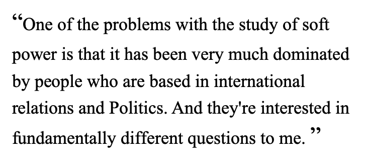 There’s always a kind of danger of presentism. One of the problems with the study of soft power is that it has been very much dominated by people who are based in international relations and Politics. And they’re interested in fundamentally different questions to me. Questions like ‘what are the policy implications of studying soft power?’ ‘How can we measure its efficacy?’ ‘How can we improve relationships between stakeholders and government?’ I’m more interested in questions like ‘why have governments historically felt it necessary to plough money and resources and time and effort into conveying culture in a diplomatic way?’ For me there’s a kind of paucity of ‘historically theoretical’ scholarship on soft power. A lot of it’s very rooted in the present because it is so presentist and policy facing.