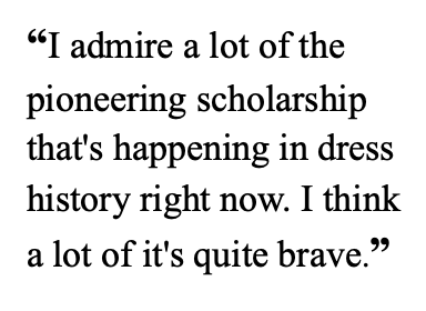 I admire a lot of the pioneering scholarship that’s happening in dress history right now. I think a lot of it’s quite brave, especially at a time when there is a lot of career precarity, and while there is some motivation because of that to expand and try something new it also means that’s sort of dangerous especially when you’re functioning in a field that’s often not taken seriously. Sarah Bendall, for example, and her book on foundation garments, Shaping Femininity (2021), are particularly inspiring. She does a lot of reconstructions, which takes a huge amount of effort and labour, and is quite a risky thing to do. But she does it in a really thorough way.