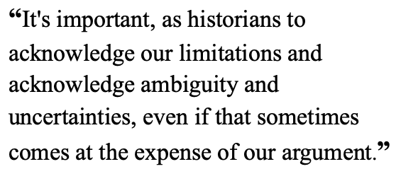 Well, because you bring up Schama, I do think that good historical writing should be, for want of a better word, beautiful. I think that looks very different from beautiful writing in, say, fiction or even in popular non-fiction, but I think that there is a way in which you can be really precise and clear and also very elegant and vivid in historical writing that makes a huge difference. As anyone who works with primary source material will tell you, the form and medium of communication can be as important as the content, and I think that stands for historical writing as well. It doesn’t hurt that it makes it more compelling as well to read. I also think that humility is very important to historical writing. It’s important for historians to acknowledge our limitations and acknowledge ambiguity and uncertainties, even if that sometimes comes at the expense of your argument. The best history I’ve read has been history that acknowledges the uncertainties in the question still open and the limitations of the material.