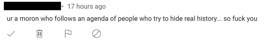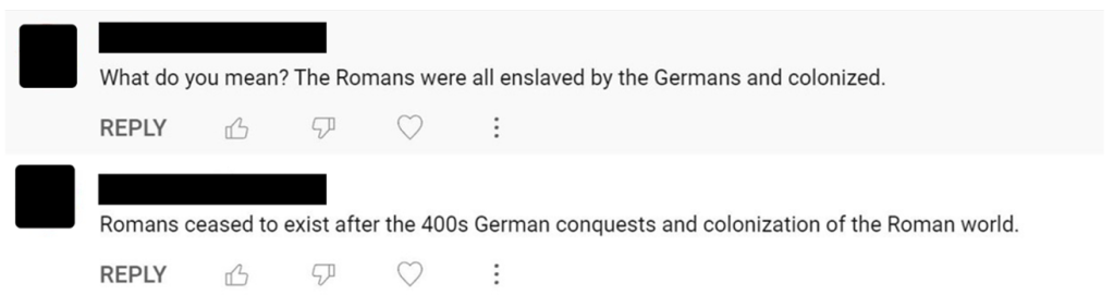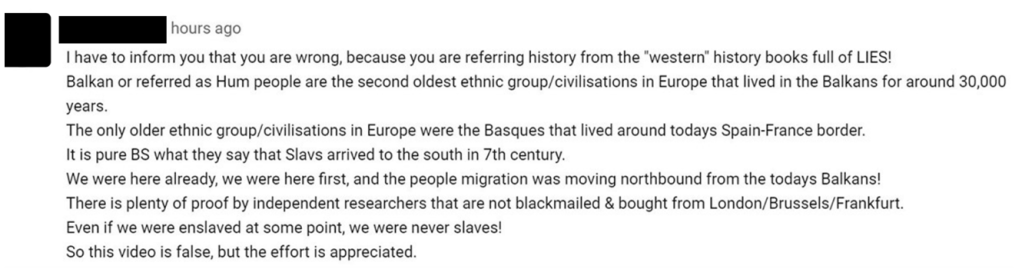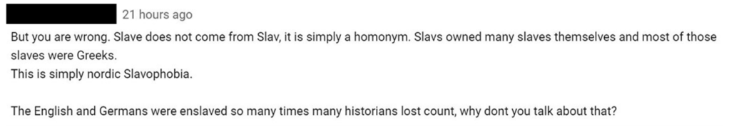 This denial of history is usually directed not just at the history being communicated by ‘lying’ history communicators but also at the history coming from academia. Because many history communicators cite academic writings in their history communication, academia is often seen as a cobelligerent in this attack on people’s historical memory. In a video on medieval ethnicity where I mention that ethnicity is a social construct, as written by Patrick Geary and Walter Pohl, one person wrote, ‘genetics aren’t a social construct no matter what the Harvard people tell you’.[6] In another video, a commenter, when they found out I studied history at Oxford (before I came to Cambridge), stated that I ‘cannot be trusted’ because I am ‘part of academia’. Lastly, when I talked about the 6th-century Slavic migrations, I was accused of using ‘western history books full of LIES’.
