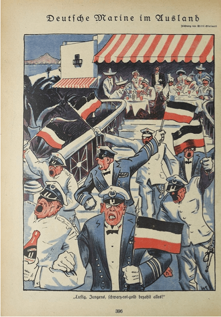 Yet the greatest contrast was between right and left. On the one hand, the right-wing press, such as the Kölnische Zeitung, Berliner Börsen-Zeitung, Berliner Lokal-Anzeiger and Hamburger Fremdenblatt raged against the unacceptable violation of German sovereignty in the authorities’ undercover surveillance on board the cruiser. By contrast, leftist papers launched tirades against the nationalist right and the equally nationalist navy: Vorwärts, for instance, claimed that the German navy was ‘one of the most superfluous things in the world’, and argued that the ‘extraterritoriality’ defence was utterly absurd. Republican and nationalist satirical journals were similarly polarised. On the one hand, the nationalist Kladderatasch mocked the Americans by portraying the cruiser bombarding the states with alcohol (Figure 1), whilst the Social Democratic Lachen Links attempted to convey the vile spectacle of nationalistic, brutish Reichsmarine sailors abroad. (Figure 2)