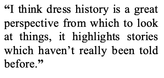 Then you have the history of dress, which is a field that has really flourished recently – I’d say within the past fifty years it’s come to the fore. It is more recognised today as a valid historical field but has maybe not always been so in the past. I think dress history is a great perspective from which to look at things, it highlights stories which haven’t really been told before. You can access the stories of people who might not have been literate for example. It’s a way into thinking about women who were making things for the fashion industry – and were not leaving a mark in another way in the historical record.