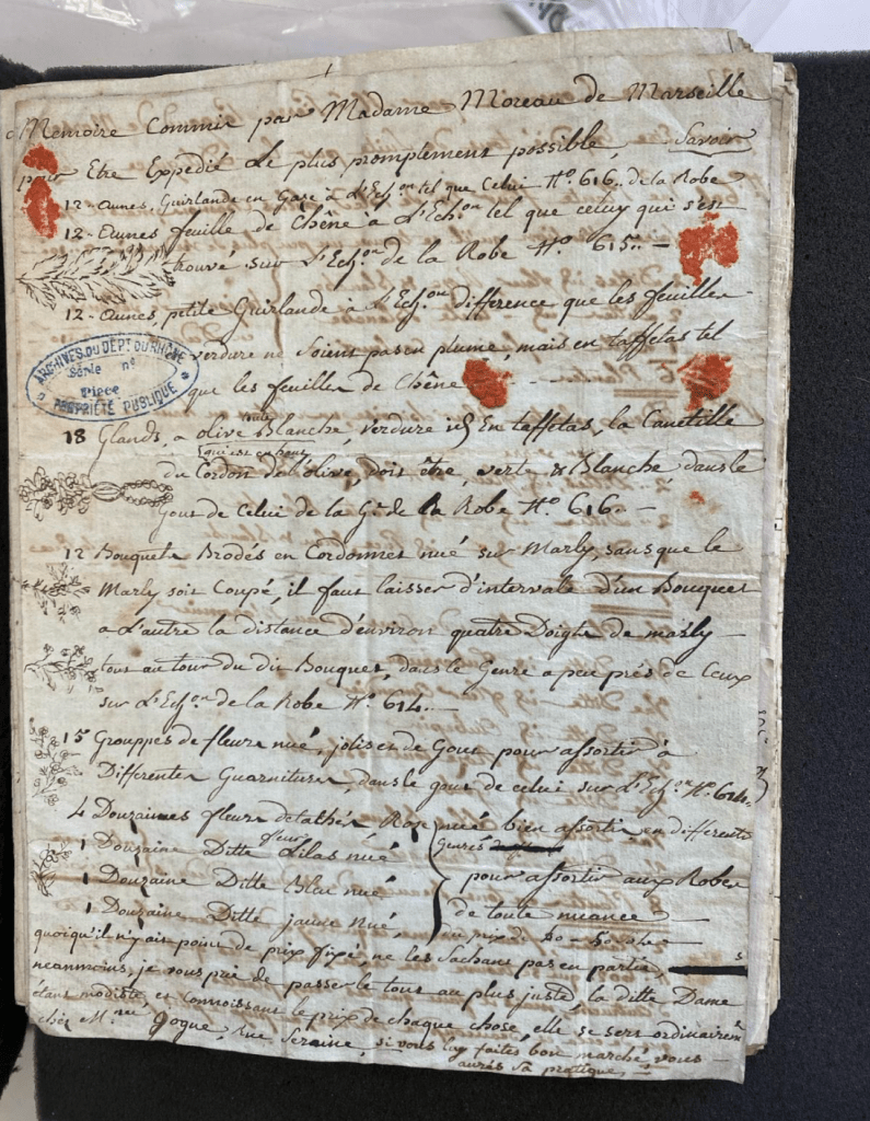 Absolutely. One of them was this fashion merchant that I discussed from Lyon. I was in the archive just a month ago and the box of her files was such an exciting one. First of all, I opened up her letters and on the first page there was a beautiful drawing of how these flowers should be arranged that a fashion merchant from elsewhere in France had sent to Mademoiselle Mandier. So they’d sent this order, ‘I want these garlands of flowers and they should be arranged like this.’ That was something I was not expecting to find and it’s just gold dust, you know? I’ve been reading for so many years these long descriptions of flowers that are part of clothing but not really to have a clear idea of how they might have been arranged and what that might have looked like, so to have these drawings was really fantastic.
