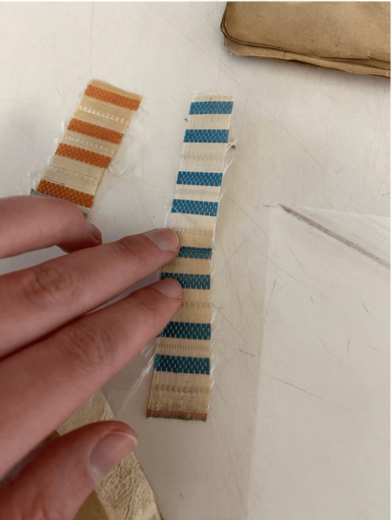 And then as part of her orderbook there were these tiny little envelopes that were pinned onto the front. And I thought, ‘Oh, I wonder if there’s something inside that?’ I went up to the archivist and asked, ‘do you think I’m allowed to open these little packets that are pinned together?’ And she said, ‘Oh I’m not sure, we’re going to have to ask the paper conservator to come and check!’ So I waited with bated breath. Eventually this paper conservator comes in, and they’re both looking at it and muttering with each other. I was just thinking, ‘please, I just want to see what’s inside these, my curiosity cannot handle this wait!’ And eventually they say, ‘yes, I think we can open these.’ So I unpinned the packet – and I unfolded it, and there were these tiny little samples of metallic braid that were silver, and sort of gleamed, and were joined by ribbon. And then the next packet was lovely – two strips of fabric printed with blue stripes and then orange stripes. And they were so fresh, and so vibrant, and it felt like I was the first person to see these in hundreds of years. I mean they might have been opened by people since in the archive or since they’d been deposited but it was such a magical moment to see the sample that the fashion merchant had slipped inside the packet 250 years ago.