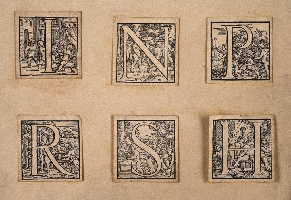 Upon first glance, these decorated woodcut initials may appear quite charming, featuring little working cherubs. But upon closer inspection, it becomes clear that they’re engaging in something a bit more macabre – bloodletting, the assemblage of a skeleton, the transportation of a corpse and the dissection of one. This is because these initials are from Andreas Vesalius’ De humani corporis fabrica – an anatomical atlas from 1555 which, some argued, revolutionised the practice of dissection and the study of anatomy itself.[1] Moving away from the Galenic tradition, it depicts only human anatomy, a departure from previous animal-based generalisations.[2] The Fabrica was a bold gambit, looking to establish itself as a foundational manual – this itself also broke away from the tradition of medical writing as commentary on the established canon.[3]