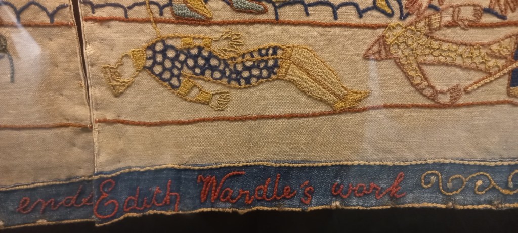The Bayeux Tapestry could be viewed as the epitome of ‘great-man’ history, with only three women pictured in its seventy metres. Female labour is overlooked in the original – despite that fact that it too was embroidered by women. Discussions on the production of the medieval Tapestry are often limited to crediting Bishop Odo with its commission. The Victorian version, by contrast, is a beautiful and visual reminder of the role played by women in its creation. Each panel still bears the name of its embroiderer stitched onto the lower border. Women are always present in history – you just have to look.
