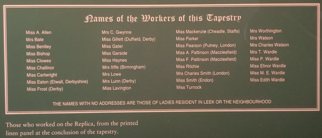 Elizabeth Wardle, a skilled embroiderer and founding member of the Leek Embroidery Society, researched the original Tapestry and visited Bayeux in 1885. She felt that England should have its own copy and the project to create a replica was born. The Tapestry was traced by Lizzie Allen from pictures held by South Kensington Museum – now the V&A. The embroidering of the replica took a year to complete with thirty-five women working on the project.