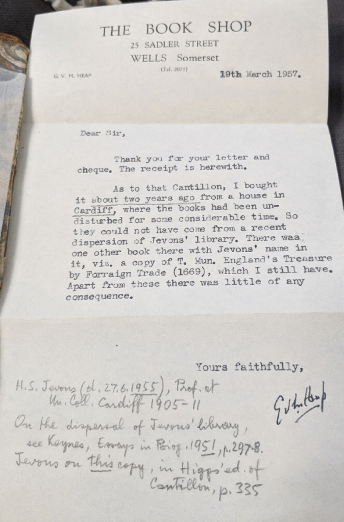 Attached to the cover is a 1957 typed letter (Fig. 1) from one GVM Heap, a Somerset bookstore owner, explaining the immediate provenance of the book: Heap had purchased it from a house in Cardiff. He further noted that the book belonged to “Jevons”—that is, William Stanley Jevons, the late-nineteenth century economist notable for his development of mathematical economics and marginal utility theory. This book on political economy, encountered by pure chance, belonged to one of the luminaries of the field.