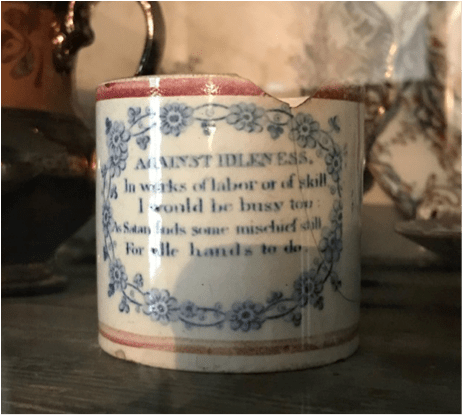 The burgeoning ceramics market did not fail to pick up on this trend. A range of pottery products – often designed for children – displayed slogans such as ‘IDLENESS BRINGS DISGRACE’ or ominous poems, as seen in this example. Likely manufactured in Staffordshire (the centre of English pottery production) in the early nineteenth century, this mug warns of the link between the idle and the diabolical: